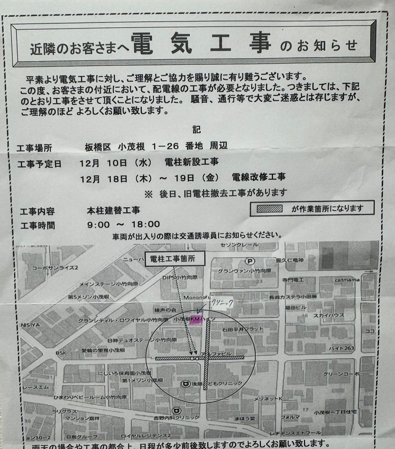 下記日程で、クリニック周辺の道路で電気工事が行われるとの事で...