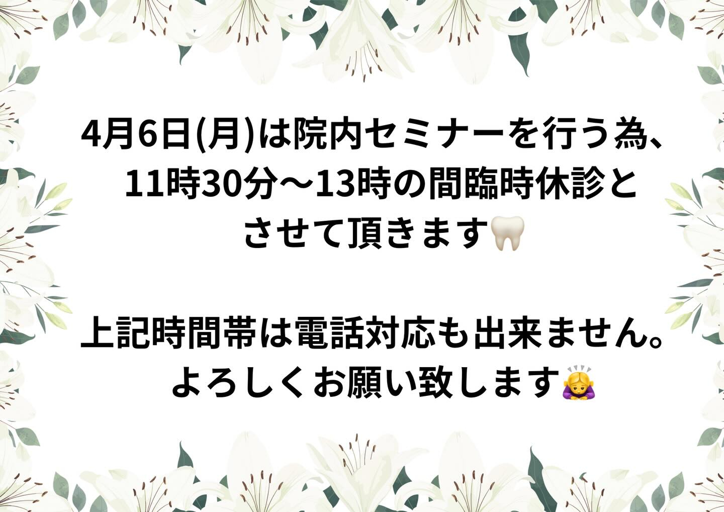 4月6日(月)は院内セミナーを行う為、11時30分〜13時の...